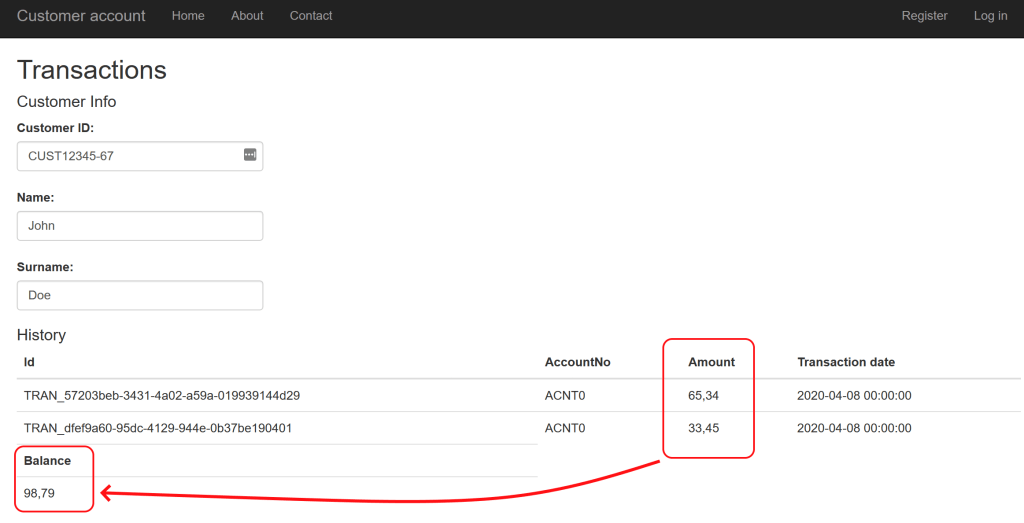 - The system presents the transaction history and user information together with the balance of the account. A transaction history item includes a transaction id, date of the transaction, the account, and the amount (the initial credit endorsed). See below.
